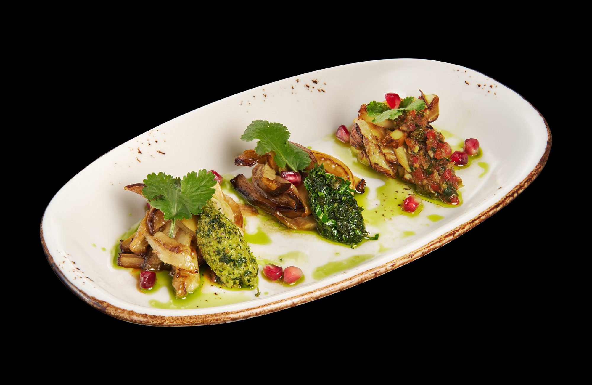 В разделе закусок гости найдут баклажаны с разными видами аджики, хумус с хрустящими баклажанами, запеченные перцы рамиро с баклажанами по-имеретински, салат из лобио с овощами и зеленью или зелёный салат с яблоками. Есть и постная версия цезаря — с грибами.