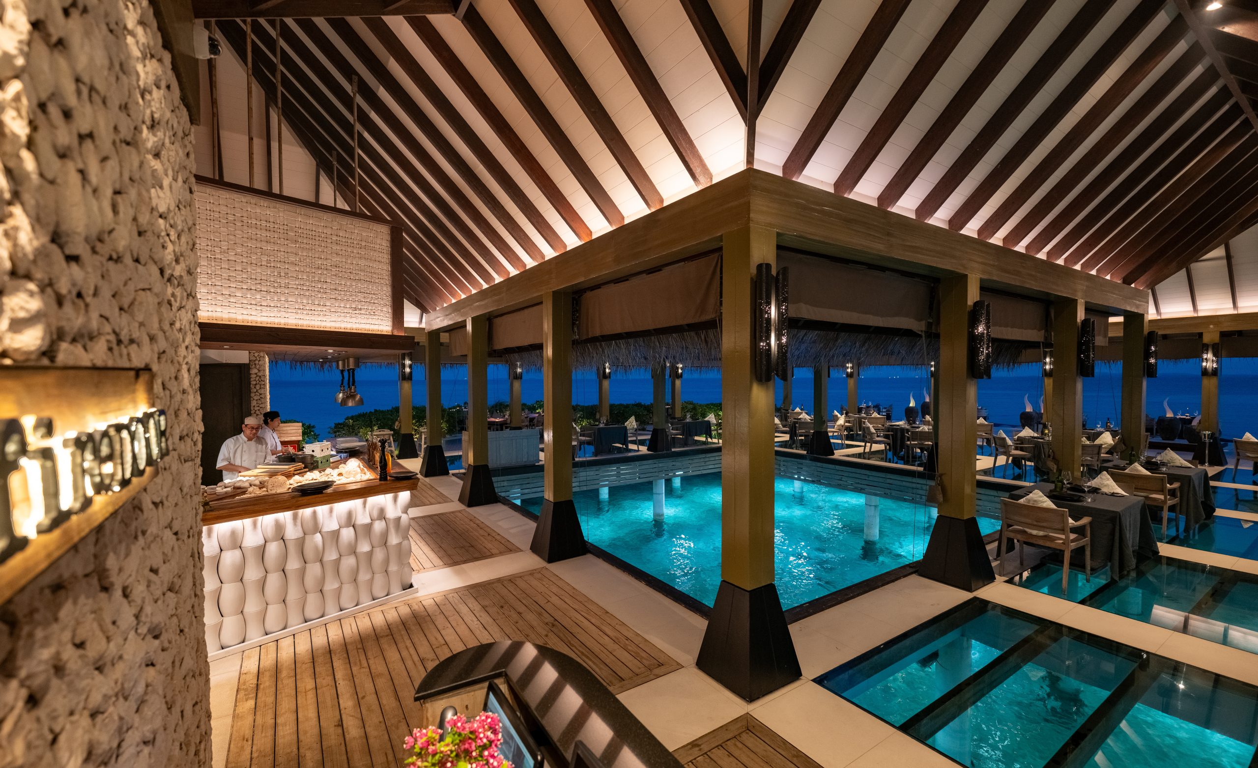 Инфраструктура включает несколько ресторанов с международной и азиатской кухней, бар с винной и коктейльной картой, спа-центр над водой, фитнес- и дайвинг-центры. Гастрономия строится на свежих морепродуктах и расслабленном формате island dining. Спа-программы сочетают азиатские велнес-традиции и процедуры в павильонах с видом на океан.